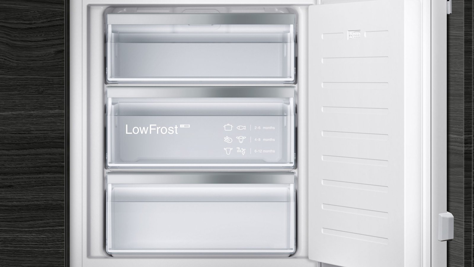 Single Einbau mit drei schubladen tiefkühl-folien, praktische und funktion Super-gefrieren für surgéler schnell. lowFrost : verringert die eisbildung, den energieverbrauch und die häufigkeit der abtauung. System-softClosing : tür ihres kühlschranks schließt perfekt und reibungslos.