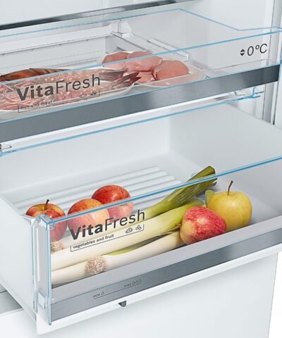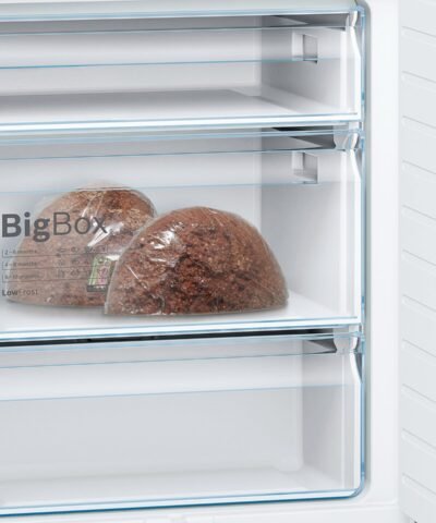 Kühl-und Gefrierschrank Kombi freistehend (Serie 6) Weiß Bosch KGE49AWCA Leistung und verbrauch energie-effizienz-Klasse: C nutzinhalt gesamt: 419 l jährlicher Energieverbrauch (kWh): 163 kWh/a klimaklasse: SN-T geräuschpegel: 38 DB Design Porte blanche seiten weiß-vertikal integrierter Griff LED Beleuchtung Komfort und sicherheit elektronische Temperaturregelung mit digitalanzeige Temperatur für jede zone getrennt einstellbar-alarm-System akustischer tür-offen-alarm-System akustisch bei temperaturanstieg memory-funktion, temperatur -, alarm-System optischer und akustischer Funktion urlaub SuperRéfrigération mit automatischer abschaltung automatische Abtauung in den kühlschrank Kühlschrank nutzbaren teil kühlen: 302 l 5 ablagen aus sicherheitsglas, davon 2 höhenverstellbar, 3 kleine und 1 großen balkonen, mechanische und elektrische flaschen-chrome-System frische Kapazität nahe 0° C: 28 l 1-fach VitaFresh ◄0°C► – fleisch und fisch bleiben länger frisch 1 fach VitaFresh auf schienen mit kontrolle der feuchtigkeit – obst und gemüse bleiben frisch und reich an vitaminen länger Gefrierschrank Kapazität der teil gefrieren: 117 l Kapazität von gefrieren (kg/24h): 6.5 lagerzeit bei störung: 20 h LowFrost – abtauung schneller und weniger häufig 3 schubladen gefrieren billigen durchlichteinheit, davon 1 Big-Box technische daten Abmessungen: H 201 x b 70 x t 65 cm türanschlag rechts, wechselbar höhenverstellbare Füsse vorne, rollen hinten wasserablauf abtauen Anschlusswert: Anschlusswert: 90 W 220 – 240 V Zubehör eierablage Charnire der tür: Rechts, reversible produkttyp: 2 türen Schubladen VitaFresh : ihre frische länger aufrecht erhalten durch die exakte kontrolle der feuchtigkeit und der temperatur. LED-beleuchtung : für perfekte sicht auf ihre produkte kosten. Fach einfrieren Big Box : für die kisten stapeln oder lagern von tiefkühlkost groß. Einschubgitter Easy Access : ein schiebe-system für den einfachen zugriff auf alle ihre frischen produkte.