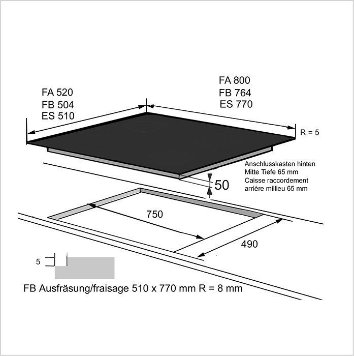 - Glas ES: H x L x P 55 x 770 x 510 mm