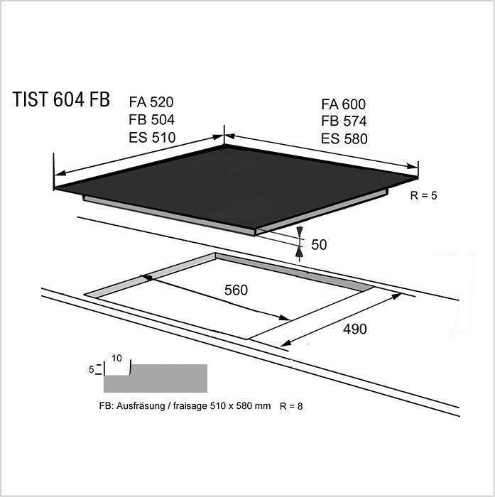 - Schneiden: H x L x P 55 x 560 x 490 mm