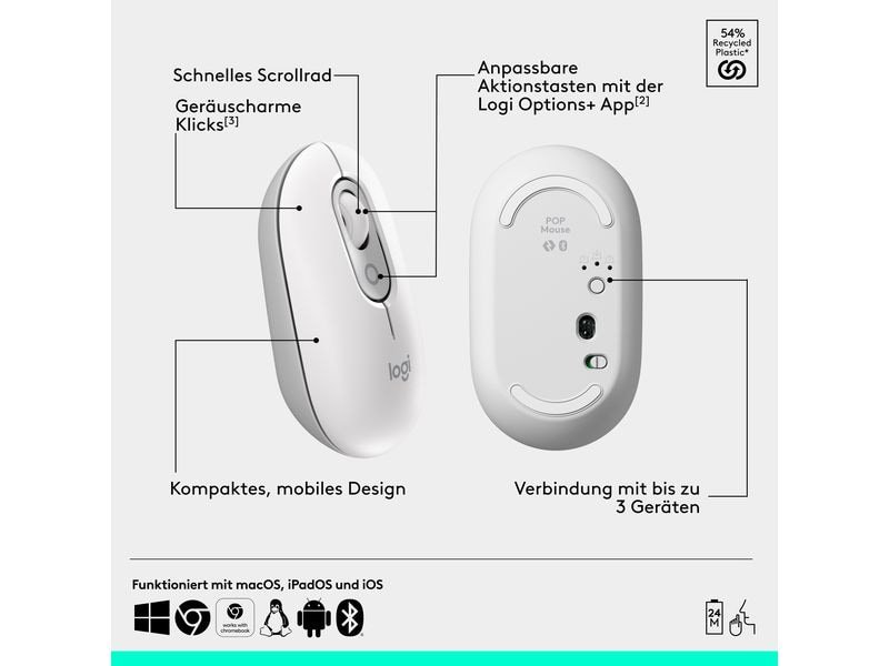 Die Logitech POP Mouse ist eine verspielte, flüsterleise kabellose Maus und wurde speziell entwickelt, damit Ihre Persönlichkeit auf dem Schreibtisch und auch anderswo voll zur Geltung kommt. Die «SilentTouch»-Technologie sorgt für einen leisen und störungsfreien Betrieb in jeder Umgebung. Mit dem «SmartWheel» schalten Sie ausserdem blitzschnell zwischen Geschwindigkeit und Präzision um und sind bei der Arbeit produktiver. Die POP Mouse lässt sich kabellos über Bluetooth LE mit bis zu drei Geräten verbinden und hat eine Batterielaufzeit von bis zu 24 Monaten.