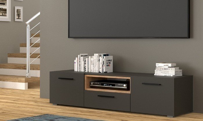TV-möbel-unten mit 3 türen und ein teil offene aufbewahrung.