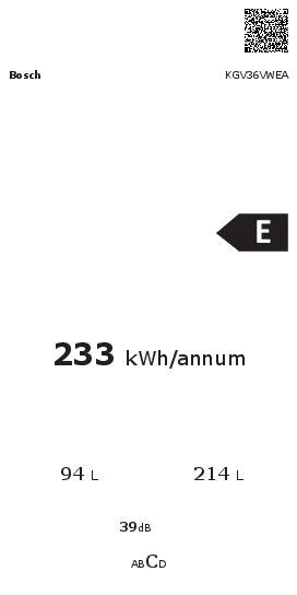 Combiné réfrigérateur-congélateur Pose libre (Série 4) Blanc Bosch KGV36VWEA Puissance et consommation Classe d’efficacité énergétique: E Volume utile total: 308 l Consommation annuelle d’énergie (kWh): 233 kWh/a Classe climatique: SN-T Niveau sonore: 39 DB Design Porte blanche, côtés blanc Poignée verticale intégrée Eclairage LED Confort et sécurité Réglage électronique de la température, lisible sur LED Commutateur de supercongél.: manual activation Dégivrage automatique dans le réfrigérateur Réfrigérateur Capacité utile de la partie réfrigération: 214 l 4 clayettes en verre de sécurité, dont 2 réglables en hauteur Clayettes à bouteilles chromées 2 petit et 1 grand balconnets Système fraîcheur 1 compartiment VitaFresh avec contrôle de l’humidité – les fruits et légumes restent frais et riches en vitamines plus longtemps Congélateur Capacité de la partie surgélation: 94 l Capacité de surgélation (kg/24h): 4.5 Temps de stockage en cas de panne: 17 h LowFrost- dégivrage rapide et moins fréquent VarioZone: répartition flexible de la zone de surgélation! 3 tiroirs de surgélation transparants, dont 1 Big Box Informations techniques Dimensions: H 186 x L 60 x P 65 cm Charnières à droite, réversibles Pieds réglables à l’avant et roulettes à l’arrière Evacuation de l’eau de dégivrage 220 – 240 V Accessoires Casier à oeufs Charnire de la porte: Droite réversible Type de produit: 2 portes Éclairage LED : pour une visibilité parfaite sur vos produits frais. Tiroir de congélation Big Box : pour empiler des boîtes ou stocker des produits surgelés volumineux. Clayette Easy Access : un système coulissant pour faciliter l’accès à tous vos produits frais. Low Frost : moins de formation de givre, c’est moins de temps passé à dégivrer et plus d’économies d’énergie.