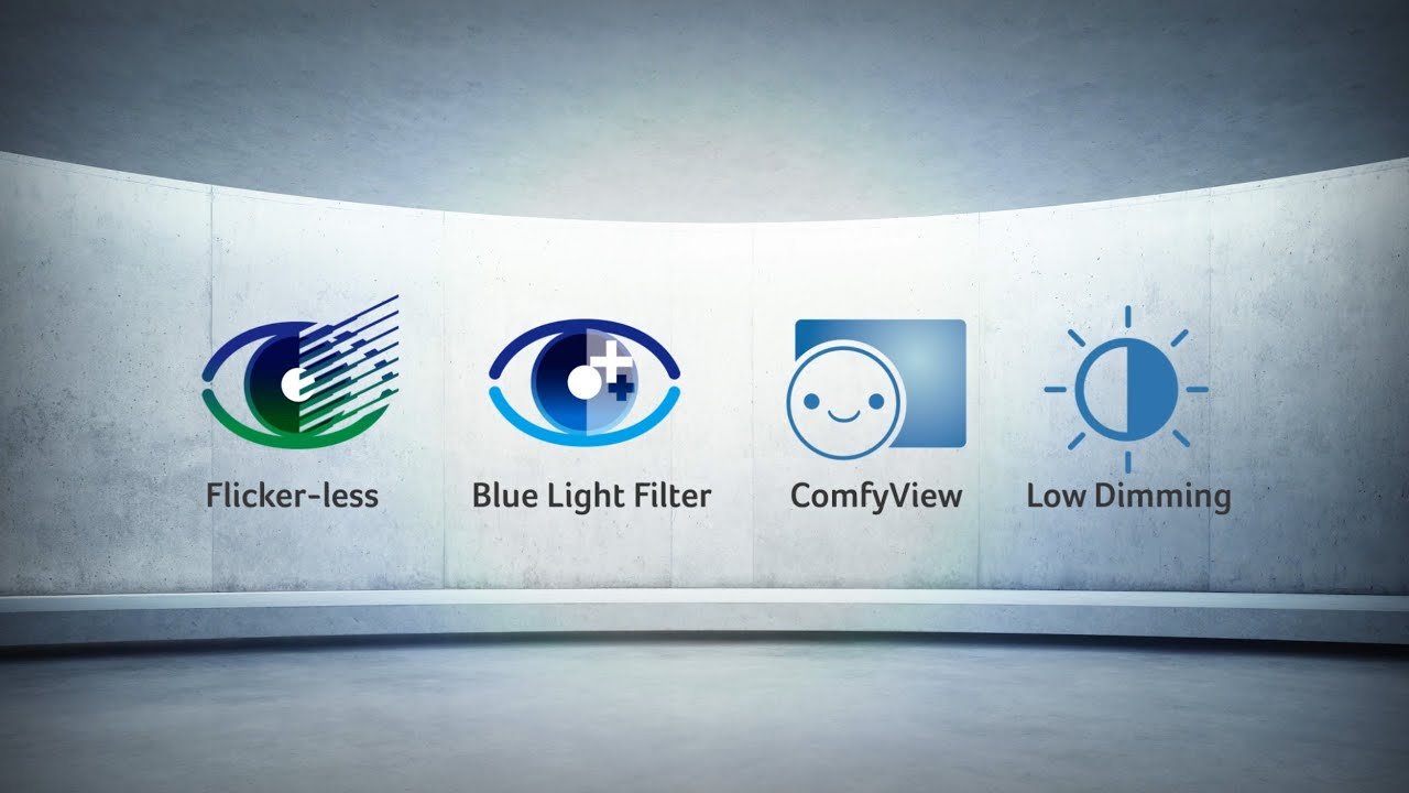 Le moniteur est équipé de diverses fonctions «EyeProtect» qui protègent vos yeux pendant une utilisation prolongée. Par exemple, «ComfyView» réduit les réflexions lumineuses. La technologie «Flicker-less» élimine le scintillement gênant de l’écran. «Blue Light Filter» réduit la la part de lumière bleue qui nuit à la rétine. «Low Dimming» permet des valeurs de gradation particulièrement basses pour une utilisation dans des environnements sombres.