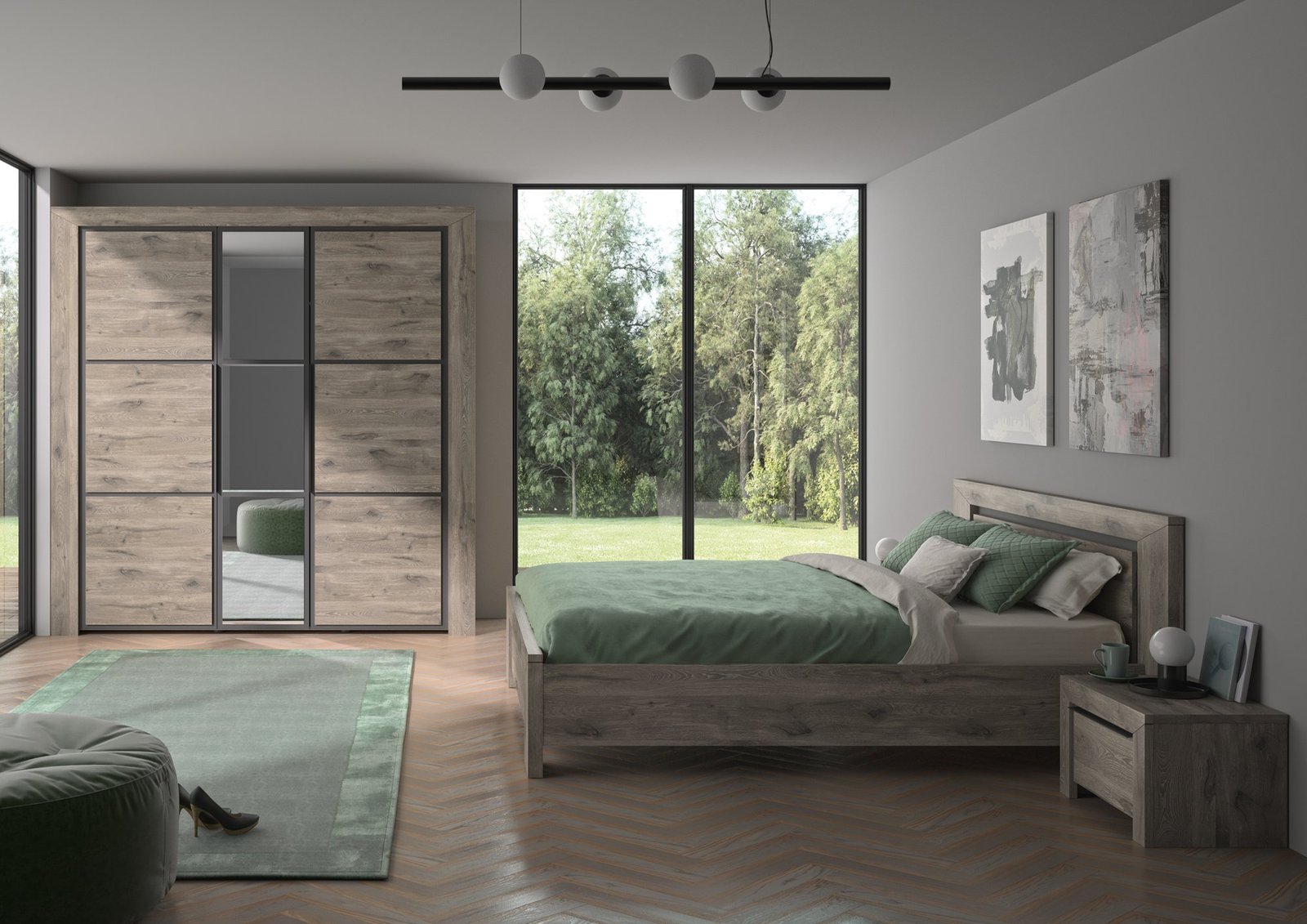 2/3 penderie (1 grande tablette, 2 tubes penderie) Meuble fabriqué en France . Porte centrale miroir avec 3 pièces aux bords biseautés, pour un rendu toute hauteur . Aménagement intérieur 1/3 lingère, 2/3 penderie . Quincaillerie amortisseur de portes à la fermeture, intégrée dans le chant de la tablette haute . Portes extérieures composées, avec 1 effet de profondeur donné par le panneau arrière noir. . Hauteur 225 cm pour optimiser au maximum le volme de rangement dans la chambre . . .