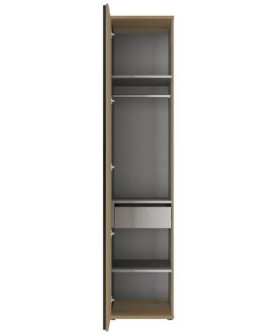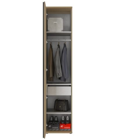 Dressing 1 porte L. 50 Marron ENZO Chêne Helvezia – 1 porte, 1 étagère, 1 tube penderie. Fabriqué en France en Vendée . Hauteur 235 cm pour optimiser au maximum le volume de rangement dans les intérieurs avec un plafond à 250 cm. . Découpes de plinthes à l’arrière pour coller complètement votre armoire au mur. . Patins réglables en hauteur pour un montage de niveau . Livré avec 1 étagère et 1 tringle . Options disponibles : lot de 2 tablettes L50, tringle L50, tiroir L50 (avec amortisseur), éclairage Led (à fixer par dessus l’armoire) . Porte avec amortisseurs de fermeture. Ouverture Gauche ou Droite. . Montage debout .