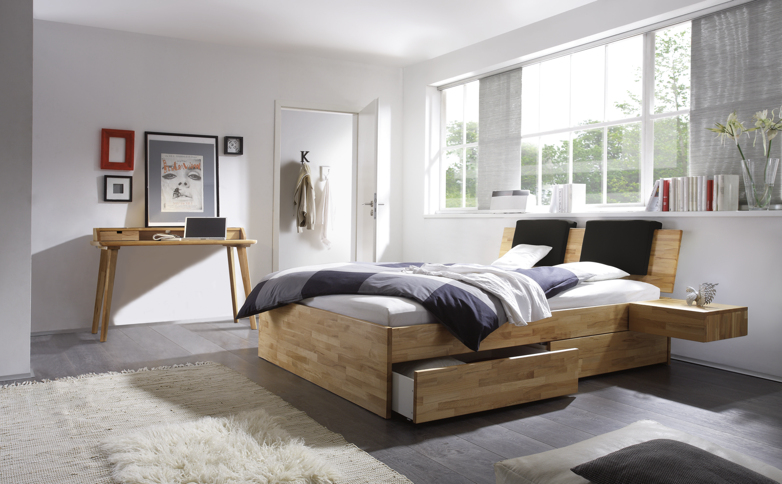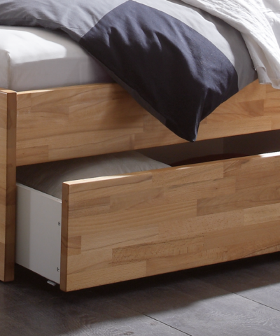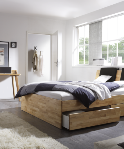 Ampezzo Standard lit / Largeur : 160 cm / Longueur : 200 cm / Bois : 80-Hêtre coeur rouge naturel, huilé / Tissu : 336-Kul smoke Lit avec 2 tioirs à literie (système d’amortissement), chacun avec un espace de rangement de 95x61x17 cm.