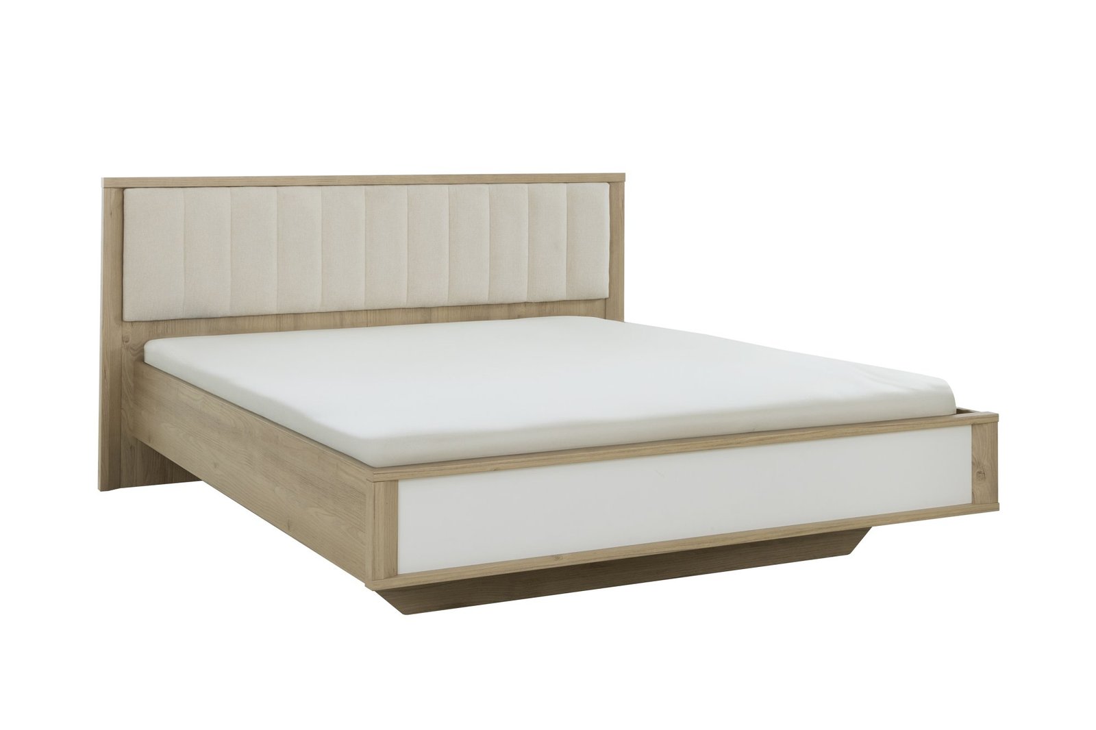 Lit MANAE Châtaignier naturel 180 – Sommier et Matelas non inclus Existe en 4 dimensions de couchage : 140×190, 140×200, 160×200, 180×200 . Grande tête de lit textile écrue, avec un tissu effet bouclette. Pour un confort optimal ! . Pans en épaisseur 22 mm pour une excellente durabilité . Le pied de lit est en mélamine blanc mat, toucher soft . Sommier non inclus . Fabriqué en France, en Vendée . . .