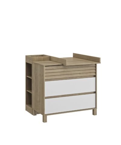 La commode de la collection Achille a été dessinée dans un style moderne et épuré, grâce à ses finitions chêne blond et blanc. De jolis détails effet « persienne » sur un tiroir vient signer la collection. Elle est dotée de trois tiroirs pour y ranger les premiers vêtements de votre enfant. Ses beaux volumes de rangement permettront de la conserver un long moment dans sa chambre. Afin d’optimiser l’espace dans la chambre de bébé, il est possible de fixer le plan à langer Achille (vendu en option) directement sur la commode. Cela évite l’achat et l’encombrement d’une table à langer supplémentaire. La commode est équipée de ralentisseurs au niveau des tiroirs afin d’éviter de faire du bruit et de réveiller bébé. Cette commode est fabriquée en France, à 50% de bois directement issu de forêts françaises gérées de manière durable et 50% de bois recyclé.