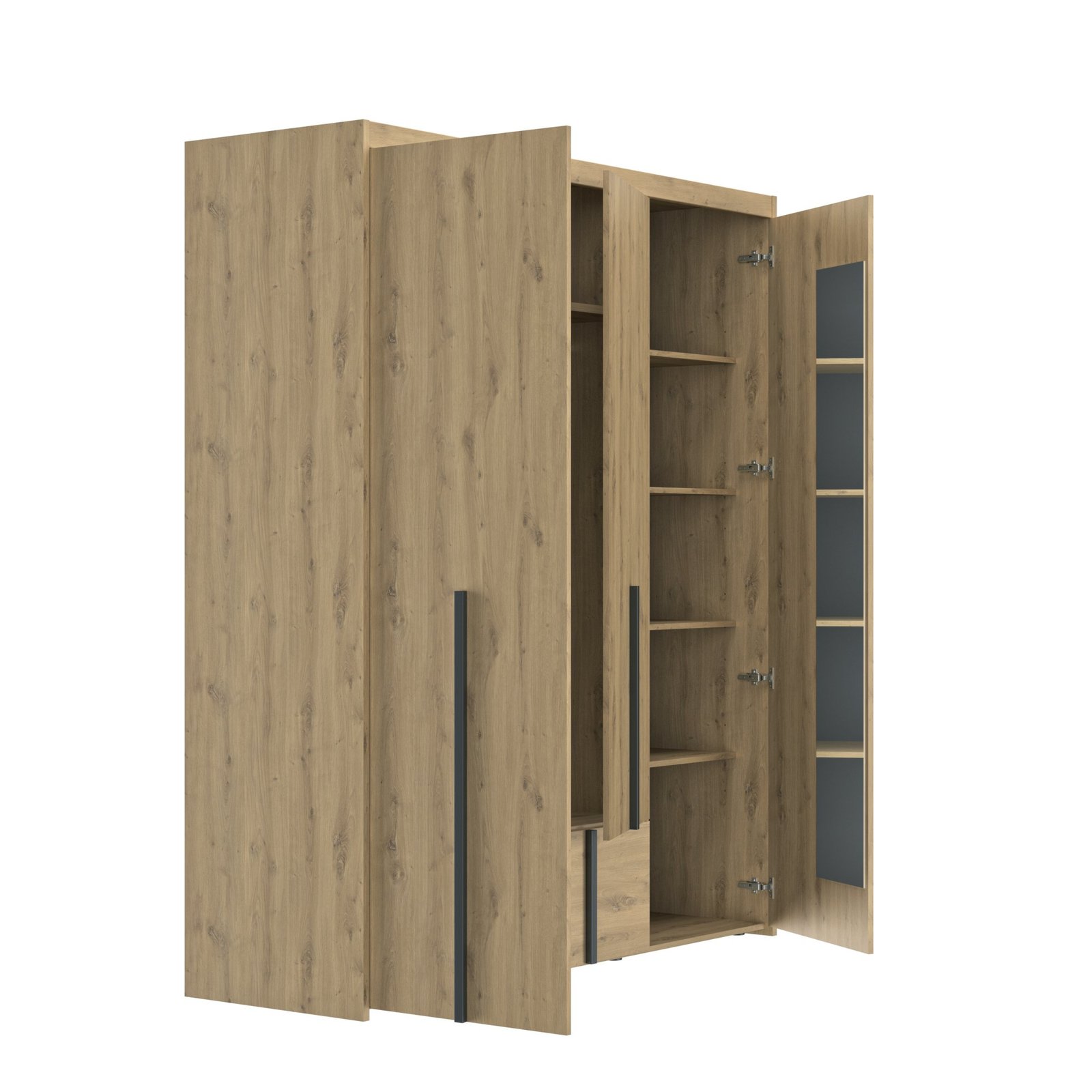 4 étagères et 1 miroir en partie droite. Existe en 2 coloris : tout chêne ou tout blanc . Très grands volumes de rangement . Aménagement 1/3 lingère (5 zones de rangement) et 2/3 penderie (1 tablette et 1 tringle). 1 niche basse et 1 tiroir central complètent l’armoire. . Miroir intérieur pour se voir de tête en pied. . Côtés de l’armoire en épaisseur 22 mm . Prises en main en mdf enrobé . Fabriqué en France, en Vendée . .
