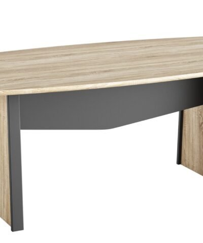 Forme tonneau pour faciliter l’échange pour des réunions jusqu’à 8 personnes Structure en panneaux de particules revêtus décor finition chêne sonoma. Montants en MDF (Médium density fiber) revêtu de décor noir ou blanc. chêne sonoma noir ou chêne sonoma blanc.