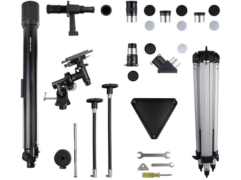 - Trépied, monture EQ-2, chercheur, 3 oculaires, lentille de Barlow achromatique 2x avec raccord pour appareil photo, miroir diagonal et filtre lunaire
