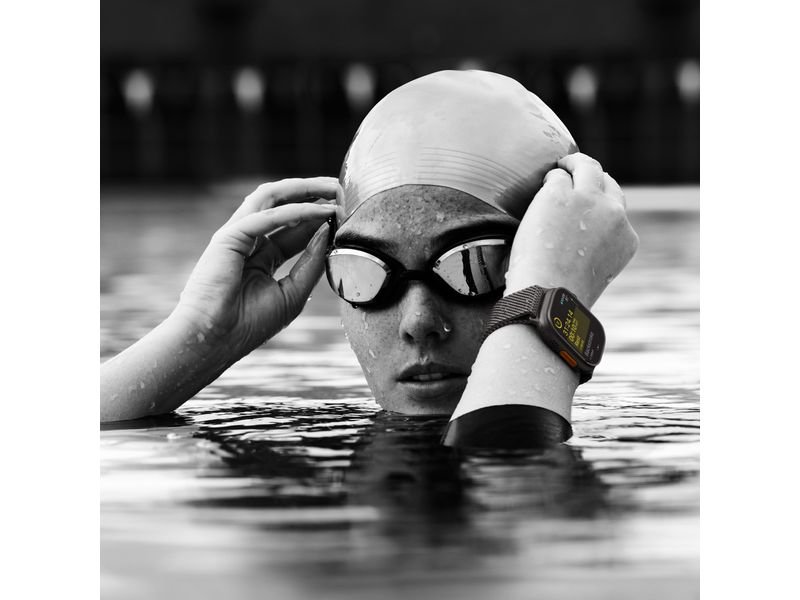 - Digital Crown avec retour haptique, bouton latéral, bouton d’action, geste double-tap, Siri